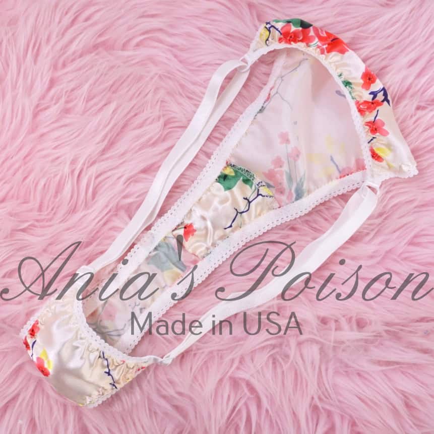 Ania’s Sissy Ladies triangle Thong Ivory Floral Satin shiny adjustable sides women’s panties sz Reg