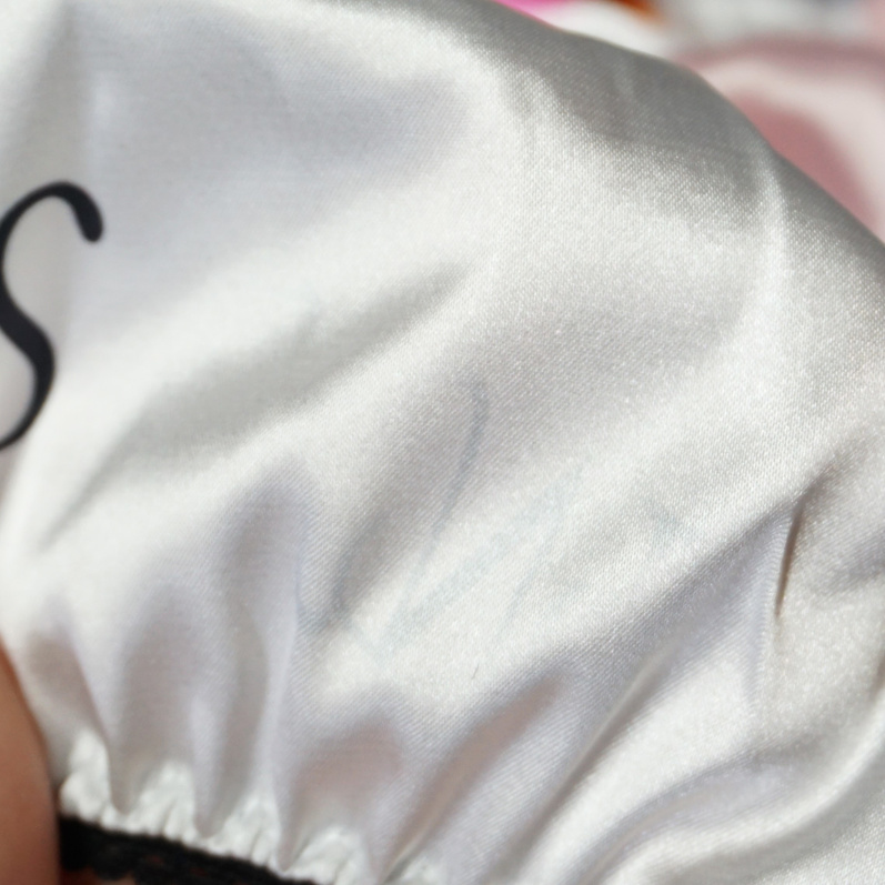 -white satin string bikini with sinner/cross print